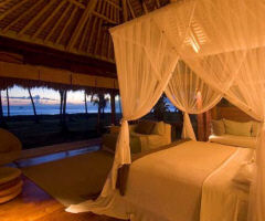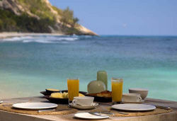 Each villa has over 450 sq meters of private space with two bedrooms, a main bedroom and a second bedroom which may be used for children nineteen years and younger at a supplemental cost. A luxuriously proportioned master bedroom with change-room and writing area leads onto a large en-suite bathroom with marble bath and two showers, one indoor and one outdoor. The bedrooms are air-conditioned, and all rooms have overhead fans. The fully retracting sliding doors allow for uninterrupted views onto the lawns and the turquoise seas in front of each villa. Each villa has satellite television, a DVD/CD system and Internet access. The kitchen leads off the lounge/dining area. A private plunge pool and sala are the finishing touches in this private sanctuary. Each villa has been individually handcrafted by Seychellois and African craftsmen on the Island from wood, local stone and glass with thatched roofs. Each villa is completely self-contained, and is raised over a metre off the ground to catch the cooling island breezes. Villas 1 to 10 are situated discreetly in the tree-line, facing onto the East Cove beach.Villa 11 (Villa North Island) isdesigned to accommodate the incline along the extreme northern side of the East Cove, and are secretly tucked away in the Takamaka forest. The beach views from these villas are spectacular. |