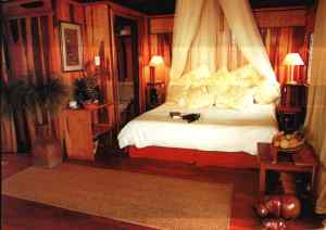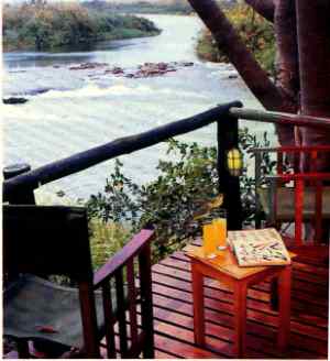 The chalets are set along the bank of a set of rapids running down from the main water access to the lodge. Each chalet has its own balcony overlooking the water. |