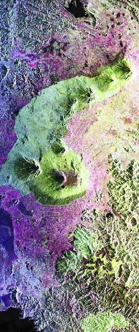 The map above shows the principal habitat of the Mountain Gorilla in the Virungas Volcanoes. This area comprises Parc National des Volcans National Park in Ruwanda, Mgahinga on the Uganda Side, and the Virungas National Park in the Congo. Kibale is north of the lake shown at the top right of the Ugana Map. Kinigi is the Park Headquaters on the Rwanda side. To provide a distance scale, it is a 45 minute drive from Lake Kivu to Runehgeri. The volcanoes have altitudes ranging from 2,000m-4,507m The map to the left is a synthetic aperture radar image image of the Virunga Volcano chain from Lake Kivu at the bottom and following along the borders of Rwanda, Zaire and Uganda. This image was acquired on April 12, 1994, by the Spaceborne Imaging Radar-C/X-band Synthetic Aperture Radar carried on shuttle Endeavour. This image is made available by NASA's Jet Propulsion Laboratory at CalTech The faint lines shown in the purple regions are the result of agriculture terracing by the people who live in the region. The vegetation types are an important factor in the habitat of the endangered mountain gorillas. Researchers at Rutgers University in New Jersey and the Dian Fossey Gorilla Fund in London will use this data to produce vegetation maps of the area to aid in their study of the remaining 650 gorillas in the region. |